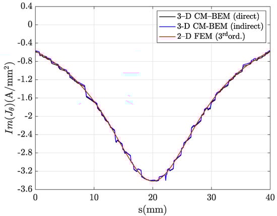 Imaginary part of the azimuthal current density component along line A-B (black line: direct formulation, blue line: indirect formulation, red line: 2D FEM, taken as a reference).