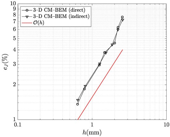 where is the reference FEM solution, computed on a very fine rectangular grid of field points in . The -norm relative error was computed by numerical integration with a 1-point Gaussian quadrature rule. Figure 6 shows the relative discrepancy for both direct and indirect formulations, evaluated for different mesh sizes. The mesh size h is defined as the maximum radius of all the spheres circumscribing tetrahedrons of the mesh. It can be observed that hybrid formulation shows similar accuracy for any mesh refinement and that the convergence behavior is linear such as first-order 3D FEM.