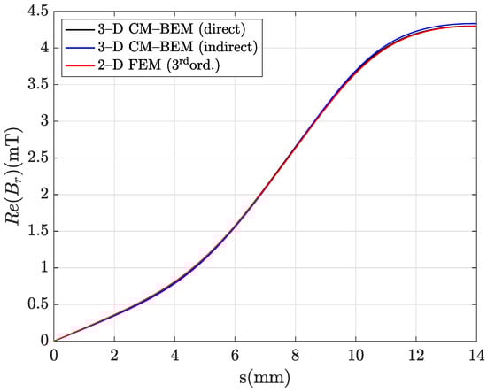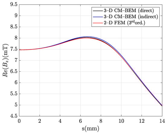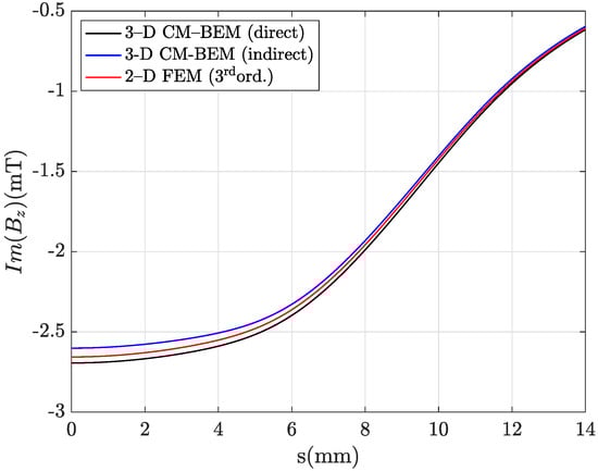 Figure 7 and Figure 8 show, respectively, the real and the imaginary parts of the radial component of the magnetic flux density . In such a case, the maximum discrepancies between the direct CM–BEM and 2D FEM results (taken as a reference) are: for the real part, for the imaginary part. Similar values were found for the indirect formulation: for the real part, for the imaginary part. Figure 9 and Figure 10 show the same comparisons for the axial field component . Maximum discrepancies are in that case: for the real part, for the imaginary part (direct formulation); for the real part, for the imaginary part (indirect formulation). It is interesting to observe that, for any field component, numerical results show a complementary behavior, with hybrid formulation values bilaterally bounding FEM reference values.
