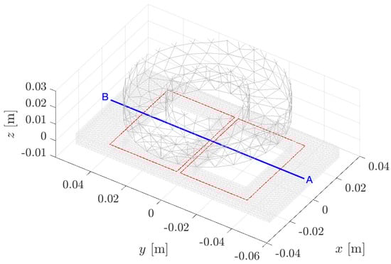 Tetrahedral mesh of the “Bath plate” model used for indirect CM–BEM simulations (field calculation line A-B is depicted in blue; virtual loops are depicted in red).