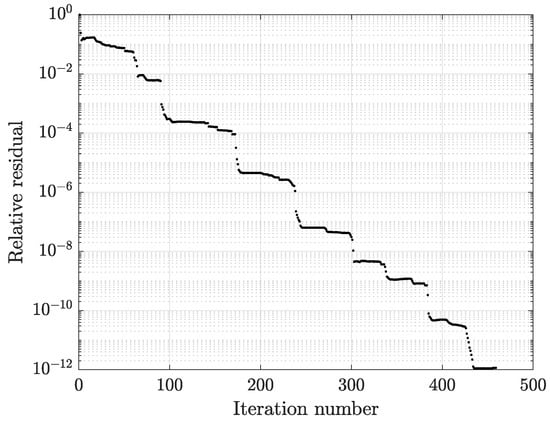 To examine the accuracy of 3D CM–BEM results (indirect formulation), the real and imaginary parts of the z-component of the magnetic flux density were computed, for both frequency values, along the line A-B. For the sake of comparison, numerical results from a second-order 3D FEM, based on a classical A–A formulation, were used. For 3D CM–BEM, was discretized into l69,492 tetrahedrons, with mesh size mm (smaller than conductor skin depth at 200 Hz, i.e, 6.22 mm), 88,443 edges, and 143,798 faces (among these, 9628 were on the interface ). was discretized into 1764 tetrahedrons. Unlike the hybrid method, 3D FEM required a bounding box (a cube of 1 m side, centered at the origin) on which magnetic wall BCs were applied. In order to get a reference solution, the 3D FEM discretization was refined up to convergence (80,862 second-order tetrahedrons were used). In particular, was discretized into 5249 tetrahedrons, with 2 mm maximum element size. Note that, with FEM, only a half of the problem was considered due to symmetry. The A–A formulation needs to introduce a fake conductivity in the air region (0.1 S/m) for the final matrix system regularization. This correction, which was not required by the CM-BEM, introduced an approximation in the numerical results. A 3D FEM model (517,341 DOFs, 3.51 GB RAM) was solved by solver with geometric multigrid preconditioning in 54 s CPU time (at 50 Hz) and in 48 s (at 200 Hz) to attain a tolerance. Preprocessing of CM–BEM required 190.25 s CPU time, including the computation of source field, the assembly of both CM and BEM matrices, and RHS vectors. Most of the computing time was required for computation of the DN map (size 9628, computed in 88.82 s CPU time) and RHS vectors with Biot–Savart’s integration (computed in 95.75 s). Note that only 14.23 seconds of CPU time were required for matrix inversion when building the DN map. The iterative solution by solver of the CM–BEM final system (with 89,997 DOFs, 565.09 MB RAM) required 93.25 s CPU time, with 459 iterations, to attain tolerance (50 Hz) and 69.18 s, with 324 iterations (200 Hz). For instance, Figure 12 shows that the solver convergence pattern at 50 Hz, which is smooth and linear. A similar behavior for TFQMR was found at 200 Hz.
