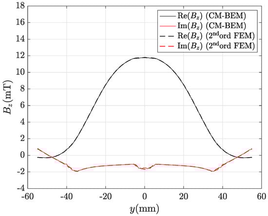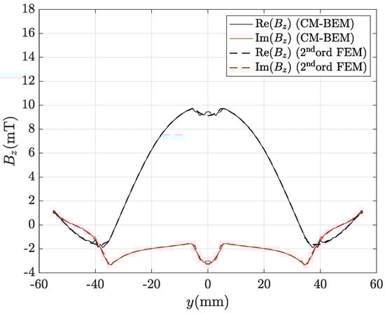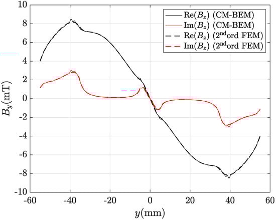 The y-axis and z-axis magnetic flux density components were evaluated along the horizontal line A-B of Figure 11 by both 3D CM–BEM and 3D FEM on 401 equally spaced points. Figure 13 and Figure 14 show that field profiles at 50 Hz are in very good agreement. The maximum discrepancies from 3D FEM, for the real and imaginary parts of , are, respectively, and , whereas, for , they are and , respectively. Therefore, even by using a relatively coarse mesh refinement for CM–BEM, a good agreement with second-order FEM is obtained. Similar results were found at 200 Hz: and , respectively, for real and the imaginary part of (Figure 15), and , respectively, for the real and the imaginary part of (Figure 16).