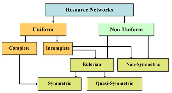 - Kuznetsov, O.P. Uniform Resource Networks. I. Complete Graphs. Autom. Remote Control 2009, 70, 1767–1775. [Google Scholar] [CrossRef]