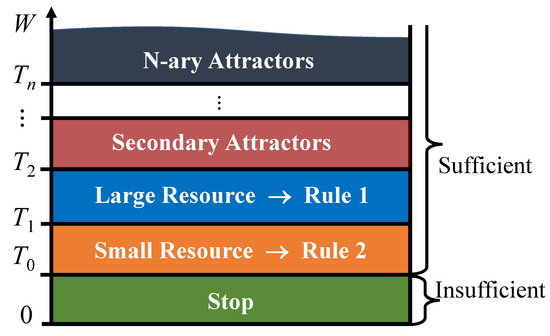Threshold scheme in a resource network with greedy vertices: separates insufficient and sufficient resource values, divides the sufficient resource into small and large values, determines the interval at which the limitations on the attractors begin to apply. Attractors of the next ranks are schematically shown.