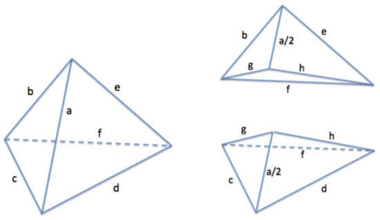 Thus, each new tetrahedron can be represented as { a/2, b, g, h, e, f } and { a/2, g, c, d, h, f }.
