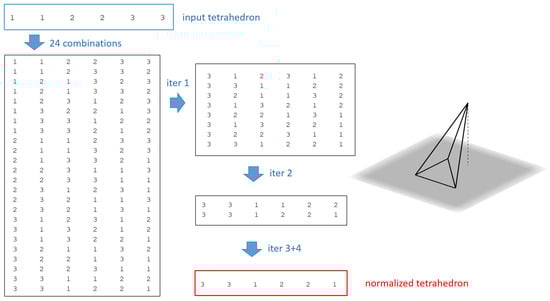 Algorithm trace for the normalization of the tetrahedron T = [1, 1, 2, 2, 3, 3, 0].