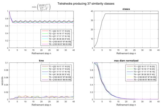 Figure 3 shows the results for 40 iterations of the bisection process. Note that 37 similarity classes are obtained at the end of the 7th iteration for each tetrahedron considered, T1, T2, T3, T4, T5, and T6 (see Figure 3 (upper right)). After Level 7, no new classes are found, and then the 37 classes remain constant, as seen in Table 2. This is in concordance with the conjecture mentioned by Adler in [11], and, therefore, we confirm the existence of a family of prescribed tetrahedra with 37 similarity classes when applying the LE bisection. Several other examples for different tetrahedra with edge lengths within 5% (nearly-equilateral), not shown here, were tested and revealed the same results.