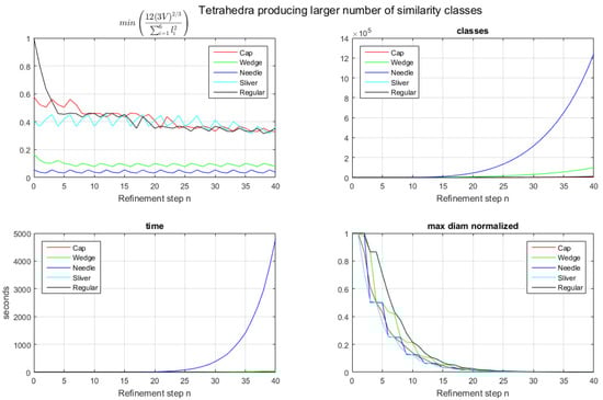 Figure 4 shows the results of 40 iterations of the LE bisection process. Note that the number of similarity classes increases for all the studied tetrahedra in every iteration (Figure 4, upper right), especially for the Needle tetrahedron, which produced more than one million similarity classes after 39 iterations in the experiment and an important curve increase in the number of classes from the 15th refinement step (Figure 4, upper right). Table 5 shows the number of classes for every tetrahedron and, for brevity, only shows refinement levels 1–20. Quality measures are shown in Figure 4 (upper left). Needle and Wedge tetrahedra show the worst quality, below 0.2, during all iterations. On the other hand, Cap, Sliver, and Regular tetrahedra keep quality levels higher than 0.32. The detailed results of min(ϑ) are presented in Table 6. Note that the time consumed of Needle is notably higher compared to the others, which is in concordance with the high number of similarity classes appearing during the LE bisection (Figure 4, lower left). Finally, as expected, the maximum length (diameter) per level decreases when approaching the horizontal axis x, as seen in Figure 4 (lower right).