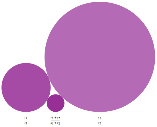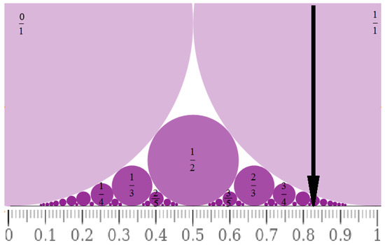 The Ford diagram is structured by the hierarchy of scales, each one corresponding to the insertion of circles tangent to two of them at the previous scales, as well as to the number line (Figure 4). In such a hierarchy, each circle is attributed to an irreducible fraction that represents its contact with the line.
