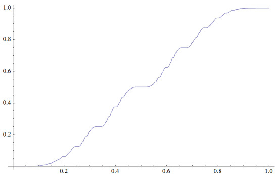 Concerning the physical reality, Koenderink concludes the same as Mandelbrot about fractal geometry, i.e., that a complex description of nature is required [42]. The phrase experimental mathematics comes up a lot in a field of chaos, fractals and nonlinear dynamics [1] (p. 158). Fractal signals appear in the spectral decomposition of significant operators, including one induced by the Rényi map (17). Results like this should be relevant for exploring the wavelet theory and its relationship to stochastic processes [43] (p. 243). The conception is concisely exposed in the book Powers of Ten, which has assigned a significance of the multiresolution hierarchy to such a number [44]. A link between the number of ten and multiscaling is the time continuum designed upon the measurement process. Information entropy of the continued fraction expansion (4) evolving by the Gauss map is that approximates to , which means that each term of the fraction should designate a decimal digit almost certainly [45]. The result was disclosed by Lochs, but it has been subsequently elaborated in the ergodic theory of continued fractions [46,47,48]. However, a distinction between the continued fraction and the binary coding is evident. Scales of the binary hierarchy evolving by the Rényi map correspond to the time that counts, one by one, squares of (Figure 1), while the continued fractions consider all squares of the same size to be one step in evolution by the Gauss map. In that regard, dynamical systems are not equivalent and results are incomparable since their time operators are diverse. Nevertheless, the importance of the decimal system in coding numbers is also related to the continuum structure since the real number corresponds to a choice sequence of the continued fraction terms, as well as the binary ones unfolding in time. It is easy to see that the Gauss map is equivalent to a power of the Rényi one in the domain of real numbers x whose first term of the continued fraction is . The isomorphism is realized through the question mark function (11).