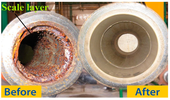 An oil pipeline before and after cleaning of the scale layer by chemical methods [26].