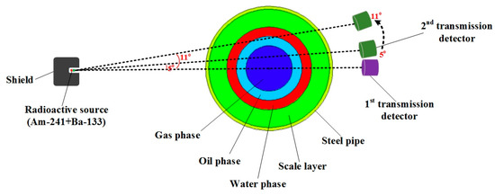 Monte Carlo N Particle code (MCNP) [27] was implemented in the present investigation in order to model the radiation-based system. As pointed out in the abstract section, the aim of this investigation is to propose an intelligent, gamma radiation-based system with the ability of measuring volume fraction of gas, oil, and water components in annular regime of a three-phase flow independent of the scale layer. Since, in this problem, there are several unknown parameters, it is not possible to measure the volume fraction using a conventional gamma radiation system that includes one radiation source and one detector. To obtain more information from the fluid inside the pipe, a system including a dual energy source consisted of 241Am and 133Ba radioisotopes that emit photons with energies of 59 and 356 keV, respectively, and two NaI detectors for recording the transmitted photons, were used.