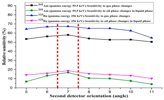 As aforementioned, in this investigation, two 2.54 cm × 2.54 cm NaI detectors were applied to record the transmitted photons. Tally F8 was utilized in order to record photon spectra in both detectors. The first detector was positioned diametrically in front of the radioactive source (see Figure 2). For the second detector, at first, a sensitivity investigation was done in order to find the optimum position. In this regard, the center of the second detector was positioned in different orientation in the range of 5°–11°, with a step of 1°, and transmitted photons were recorded. Orientation of 5° was the minimum possible position for the second detector, because, at less than this orientation, the first and second detectors would interfere with each other. The reason for choosing orientation of 11° as the maximum position was that, at more than this orientation, there would be no more transmitted photons through the pipe that carries on useful information about the three-phase flow to reach the detector. At each position, sensitivity of the second detector relative to gas phase and oil phase volume fraction changes was investigated for both registered counts of gamma radiations emitted from 241Am and 133Ba radioisotopes. For instance, calculation of sensitivity of registered counts under 241Am photo peak in the second detector relative to gas phase changes is indicated in Equation (1). It is worth mentioning that the sensitivity was calculated using the registered counts for gas phase fractions of 10% and 80%, which make the highest and lowest attenuation for photons.