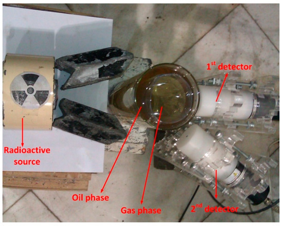 It is worth mentioning that the simulated configuration in this work, especially the performance of the detectors, has been validated in our previous study using some experiments [28]. The corresponding experimental setup can be seen in Figure 4. A geometry identical to the experimental setup was simulated using MCNP code, and then the registered counts in both detectors were compared with the experimental ones. Calibrations of the gamma attenuation-based devices used for measuring the three-phase flow characteristics are usually done for three different extreme cases when the pipe is completely filled by gas, oil, and water. In the present study, a detection system the same as the validated one in our previous work was modeled. However, in the present study, a gas–oil–water three-phase flow was modeled instead of a two-phase flow.
