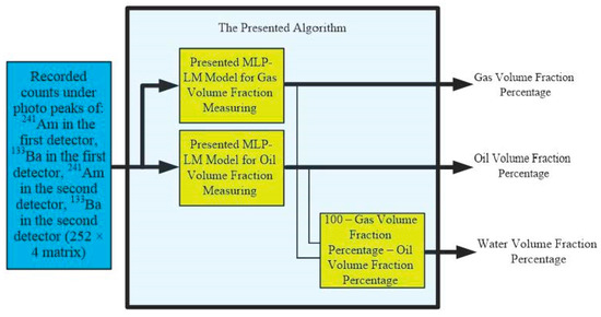 In recent years, it has been proved that artificial intelligence can be implemented as a powerful tool for various engineering applications [29,30,31,32,33,34,35,36,37,38,39,40,41,42,43,44,45,46,47,48,49,50,51,52,53,54,55,56,57,58,59,60,61,62,63,64,65]. There are several kinds of ANNs, in which multilayer perceptron (MLP) is the most well-known kind of them. This kind of ANN has a good ability for regression and classification. This network is constructed from at least three layers of neurons: The input layer, the hidden layer (or hidden layers), and the output layer. There are different techniques to calculate the biases and weights of this mathematical network, of which Levenberg Marquardt (LM) is most well-known algorithm in this regard. In the present investigation, two different MLP–LM networks with four inputs and one output were considered. Four features were extracted from the recorded spectra in the detectors and were considered as MLP–LM inputs. The procedure of obtaining gas, oil, and water volume fraction percentages independent of scale layer thickness is indicated in Figure 5. The trained networks can estimate the percentages of gas and oil volume fraction based on input signals independent of scale layer thickness, correctly.