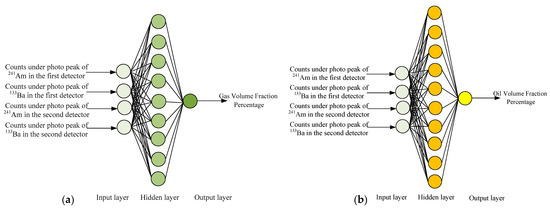 Architectures of presented MLP–LM models (a) for gas volume fraction measuring (b) for oil volume fraction measuring.