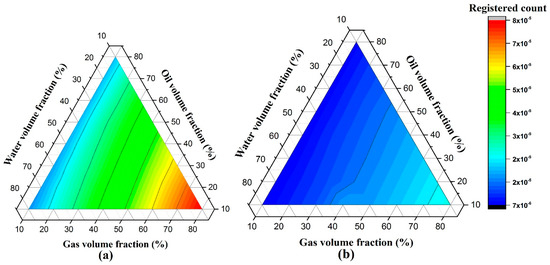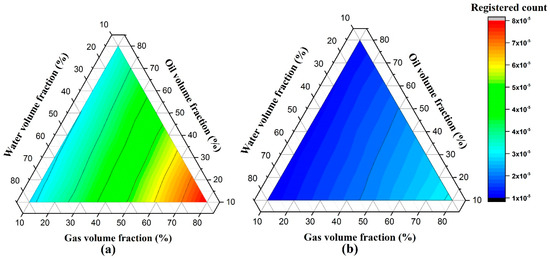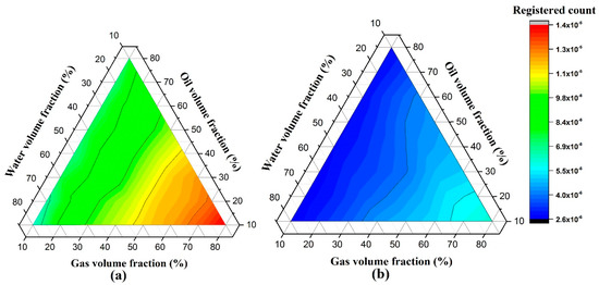 After finding optimum positions for the detectors, orientation angle of 0° for the first detector and 7° for the second detector, counts under photo peaks of 241Am and 133Ba radioisotopes were recorded in both detectors for different scale layer thicknesses and volume fractions. Ternary contour plots of the recorded counts in both detectors for different volume fractions when the scale thickness is 0 and 3 cm, are shown in Figure 7, Figure 8, Figure 9 and Figure 10. Comparing Figure 7 and Figure 8 that correspond to the recorded counts in the first detector for 241Am and 133Ba radioisotopes, respectively, it can be said that dynamic range of registered counts relative to changes of gas volume fraction, or, better to say, sensitivity, for 133Ba is more than 241Am. A same response is also observed for the second detector. Comparing Figure 7a,b, it could be observed that, when scale layer is 0, sensitivity of detector relative to changes of gas, oil, and water components is much more than when the scale thickness is 3. In other words, by increasing thickness of scale layer, somehow information about the flow of inside the pipe starts fading. This manner can be also seen for both detectors and radioisotopes. Comparing Figure 7a and Figure 9a, it can be observed that sensitivity of the second detector relative to changes of volume fractions is a little bit more than the first detector.