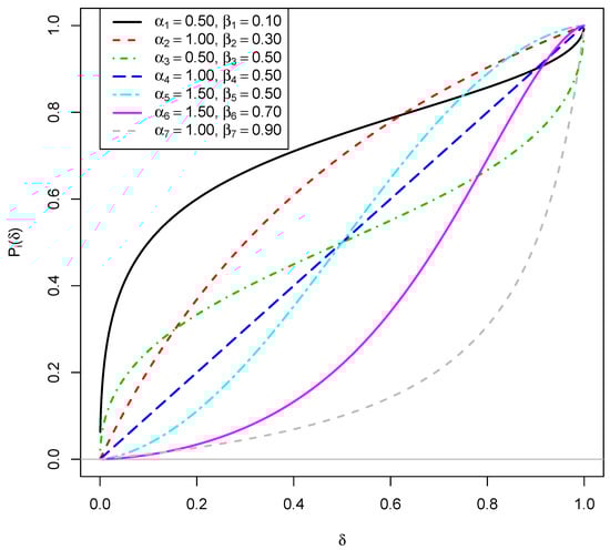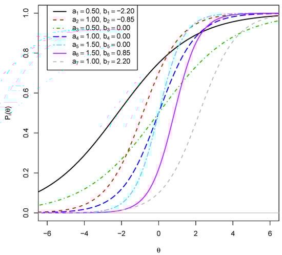 where G is some distribution on . Item discriminations are non-negative and indicate the extent to which item i measures the trait . Item difficulties range between 0 and 1 and primarily determine the proportion of correctly solving item i. The IRF in Equation (8) is also referred to as the rational function model with two item parameters [15]. The IRFs of the LDS model for seven items are shown in Figure 2 (see the figure legend for item parameters and ).