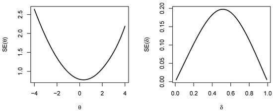 In Section 3.2, we demonstrated that the LDS model is equivalent to the 2PL model. For the item parameters of the seven items used in the demonstration (see Table 1), the conditional standard errors for and are shown in Figure 3. It can be seen that the 2PL model measures the latent trait less precisely for extremely large negative and extremely large positive values; that is, for low- and high-achieving persons. In line with the results of [3], the converse holds for the LDS model. Conditional standard errors are smallest for persons with values near 0 or 1. Hence, statements about measurement precision in different ranges of values for the latent trait strongly depend on the chosen metric (see also [26]). Interestingly, the transformed latent trait (the so-called arc length metric; see [6]) has homogeneous standard errors among the latent trait
