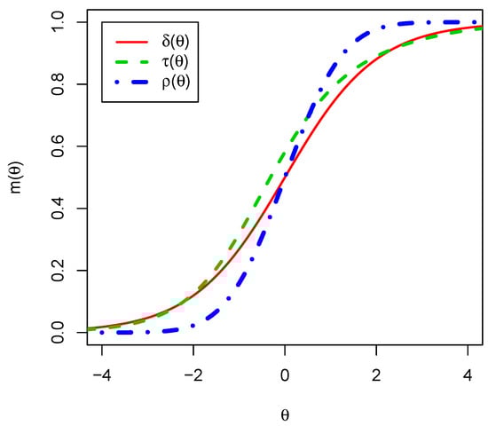 where f denotes the density function of the latent variable (also denoted as the latent trait), and denotes the item response function of item i. Note that items are conditionally independent given the latent trait . The model parameters in Equation (1) are typically not uniquely defined. Assume that one utilizes a monotone function for defining a transformed latent trait by . For example, m could be the logistic function that maps the real line onto the unit interval . Define , where denotes the inverse function of m. Furthermore, denote by g the density function of the transformed latent trait . The IRT model in Equation (1) can be equivalently written as