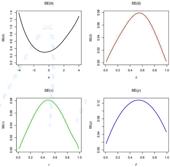 Using (30), the standard deviation of can be computed similarly to (29). Furthermore, conditional standard errors for the four latent trait metrics are computed for the whole sample containing all students. The item information is obtained by using the second derivatives of IRFs with respect to the metrics , , , and (see Equation (17)).