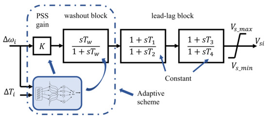 In Figure 1, the proposed adaptive scheme is included in the power system stabilizer model to attain improved dynamic performance. This non-linear model is used to validate the tuning on the proposal. The Equations (1)–(3) are not used for design purposes. The time response of some variables is used to train the adaptive scheme in offline stage and then also in online learning operation.