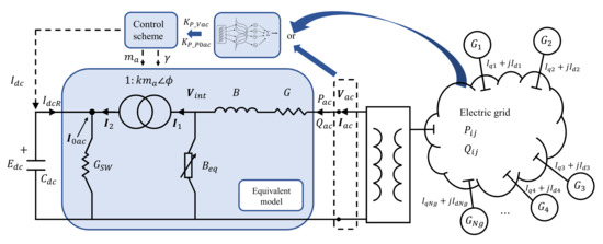 where k is a known constant; is the DC voltage on the capacitor terminals; is the phase angle of in phasor form, and; in this model emulated the index modulation to regulate the voltage magnitude.