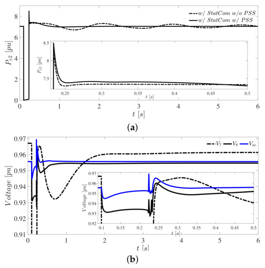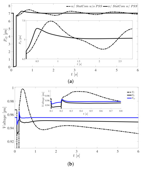 Case 1: (a) real power at generator 2; (b) voltage magnitude in bus of StatCom connection.