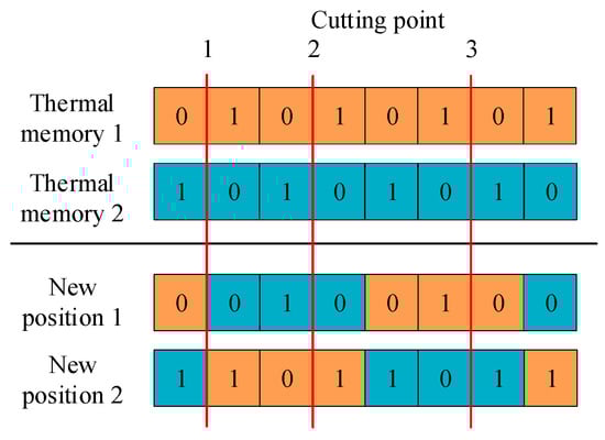 In the GA, the parent of the offspring with a better fitness value is selected to generate an offspring of solutions through evolutionary operators, including crossover, mutation, and elitism. The crossover has a powerful global search capability, which can explore new areas in the search space. This study uses a crossover operator with three random cutting points to create a new solution. First, a pair of solutions are randomly selected from the historical best solution stored in the TM. Next, the crossover operator creates two new solutions by cutting the pair of solutions at three random points and swapping segments. Then, one of the new solutions is randomly selected as the current solution. Figure 3 illustrates the crossover operator with three cutting points.