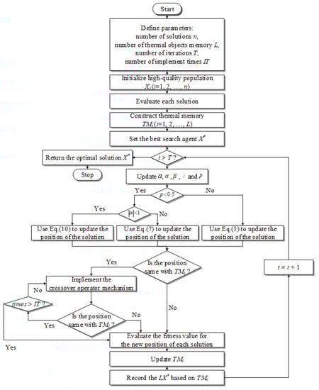 The proposed algorithm is combined with TM and four improvement mechanisms: the high-quality initial population, improvement for the exploitation phase, crossover operation, and update best-so-far solution. The pseudocode and procedure of the proposed algorithm are shown in Algorithm 1 and Figure 4. The implementation time IT is used to prevent falling into an infinite loop and the increase of a large number of computation costs. When solving low-dimensional problems, because population diversity is not high, it will take a long time to implement the TM mechanism. The size of the thermal memory TM will also affect the calculation cost because, when implementing the mechanism for escaping the local optimum, it will check whether the solution matches the memory one by one. Therefore, the appropriate IT value and thermal memory TM must be selected to optimize the calculation cost. In this article, IT = 20 and the size of thermal memory TM = 10 are the settings for all case studies.