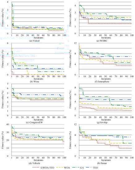 - Improvement in the initial population: in general, the traditional meta-heuristic algorithms randomly generate the initial population. However, this randomness may lead to non-uniform and low-quality population distribution and slow convergence. Therefore, an initial population generation mechanism combined with a local exploitation algorithm is proposed in this paper. This mechanism can increase the probability of the population approach being the global optimum. Figure 5 shows the convergence curve of GWOA-TEO and three comparison algorithms. The experimental results show that in seven of the eight repository data sets, including Vowel, Wine, CongressEW, WDBC, Ionosphere, krvskp and Sonar, the improved initial population has a better fitness value than the randomly generated initial population.