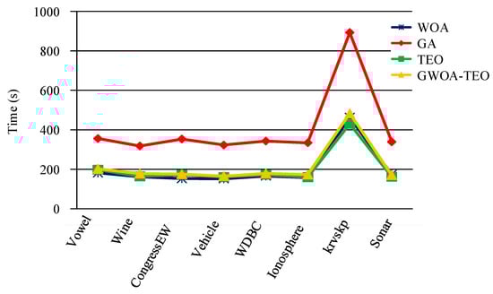 From Table 6, the results show that the GWOA-TEO is valid in the feature selection field. The GWOA-TEO has the best average classification accuracy for eight adopted datasets. The WOA has better average classification accuracy than the TEO on six of eight datasets, including Vowel, Vehicle, WDBC, Ionosphere, krvskp, and Sonar. However, in the less-feature-dataset case, such as Vowel, Wine, and CongressEW, the average classification accuracies of the TEO are better or the same as those of the WOA. These results show that TEO has better local search capability than WOA, while in the multi-feature-dataset cases, such as Vehicle, Ionosphere, and Sonar, the GA has better average classification accuracy than the WOA. These results also show that GA has a better global search capability than WOA. The proposed algorithm GWOA-TEO combines the advantages of TEO and GA, which achieves the best average classification accuracy in this study. As shown from the average computational time in Figure 6, GA is the best computing costs algorithm. Besides, the average calculation time of GWOA-TEO is very close to that of WOA and TEO. GWOA-TEO can maintain computing costs, and classification accuracy is better than other algorithms.