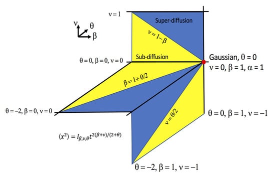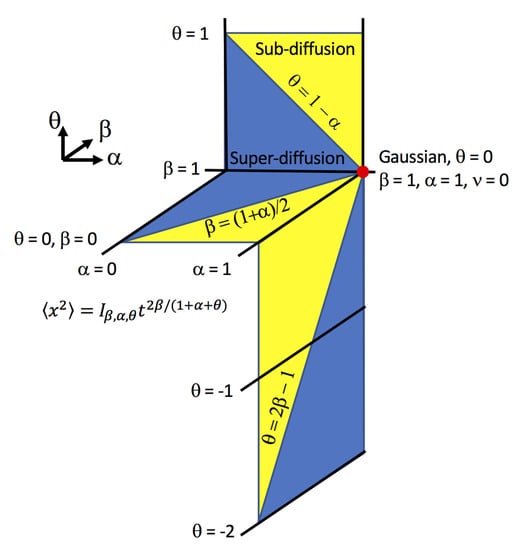 In the general case, this model fills the anomalous phase cube {} with regions of sub- and super-diffusion that correspond to the situations where the exponent of the MSD, , is less than or greater than one. Classification of this behavior in terms of sub- and super-diffusion is displayed in Figure 2.