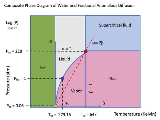 This solution, which is the characteristic function of the P(x,t), also describes the time decay of each spatial frequency of the associated random motion. It yields particular cases for selected values of the fractional derivatives: Gaussian (), Lévy process (), and subordinated Brownian motion for (). These special cases of anomalous diffusion for the CTRW model are displayed in Figure 1 as a two-dimensional phase diagram. This phase diagram corresponds with the plane of the anomalous phase cube {} in Figure 1.