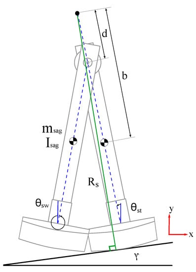 The kinematic parameters of the sagittal plane model are the foot rolling radius and the lengths b and d, as Figure 1. depicts. With respect to sagittal plane dynamic parameters, the system is described by the mass , the center of mass , and the inertia moment of each leg of the SPBR. In the case of the SPBR frontal plane model, the kinematic parameters which describe the system are the length a, the separation angle , and the foot rolling radius , as Figure 2 shows. Moreover, the considered dynamic parameters are the mass , the link mass center , and the inertia moment of both SPBR legs considering them as a single link.