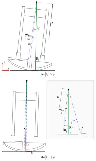 where is the positive semi-definite symmetric inertia matrix, is the centrifugal and Coriolis force matrix and is the vector of gravitational forces of the SPBR. Additionally, indicates the considered system states for frontal and sagittal plane, respectively, and is the control strategy called in this paper as semi-passive control one and is described in Section 2.1.3. The subscript assigns the evaluated dynamic behavior in the single support phase. In the case of the single support phase of the sagittal plane, is assigned in (1); furthermore, the generalized coordinate vector is established as , where the subscripts refers to the current role of the leg; thus, the subscript sw is assigned to the swing leg and the subscript st to the stance leg. With respect to the single support phase of the frontal plane, the system’s behavior is described by two dynamic conditions that depend on the angular position of the SPBR. Considering Figure 2a, the first condition is presented when ; here, and are set in (1) to define a rolling movement caused by the foot radius . The second condition models the system as a fixed kinematic chain and occurs when (see Figure 2b); this means that the stance leg rotates around the inner foot edge. For this second condition is assigned in (1). For more details about single support phase model, see Appendix B of [14].
