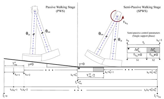 The proposed control strategy called semi-passive control one is focused on showing that the SPBR design can improve its walking performance by considering the passive dynamics of the system into the integrated design approach. Thus, to explore the influence of the robot’s passive properties into design tasks, the system’s dynamic behavior is tested over two consecutive walking scenarios known as Passive Walking Stage (PWS) and Semi-Passive Walking Stage (SPWS). The number of evaluated collisions determines each walking stage, assigning for the collisions in the PWS and for the collisions in the SPWS. These scenarios are only defined for the sagittal plane dynamics and their evaluation is carried out along the sagittal plane walking time , from to as Figure 3 shows. In the following, both walking scenarios are explained.