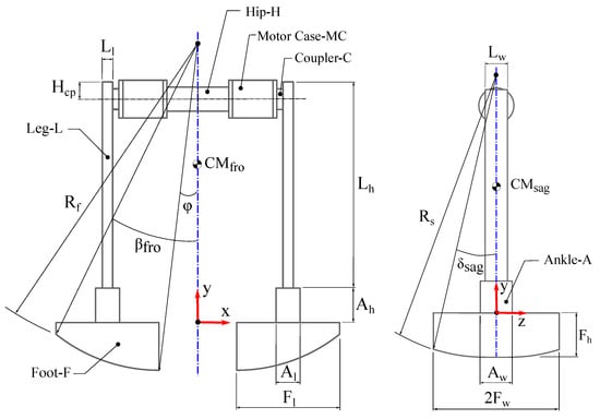 The structural design variables indicate the geometric description and the material assignment of the main structural elements of the SPBR. These structural elements are Foot-F, Ankle-A, Leg-L, Hip-H and Motor Case-MC. The geometric parametrization of the SPBR is shown in Figure 4 and Figure 5. Each leg of the SPBR is composed by the structural elements Foot-F, Ankle-A and Leg-L, where the part Foot-F is characterized by the subset of geometric entities which depicts this element in both frontal and sagittal plane. On the other hand, the parts Ankle-A and Leg-L are described by their length-l, height-h and width-w parameters; hence, the subsets which establish their geometry are and , respectively. The joint of the SPBR is structurally determined by the elements Hip-H, Motor Case-MC and Motor-M, each per system leg. The Hip-H parameters are the radius , length and the variable that describes the distance between the upper edge of the Leg-L and the axis of the joint. The Motor Case-MC is described by its length and the radii and ; also, the dimensions of each lateral cover of this structural element are the length and the radius . Furthermore, the material assignment of the structural elements Foot-F, Ankle-A, Leg-L, Hip-H and Motor Case-MC is considered through their corresponding density values , , , and , respectively. Hence, the vector of structural design variables is: