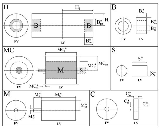 Structural element parametrization. The label * is assigned for constant geometric values. Additionally, the notation FV = Frontal View and LV = Lateral View is considered.