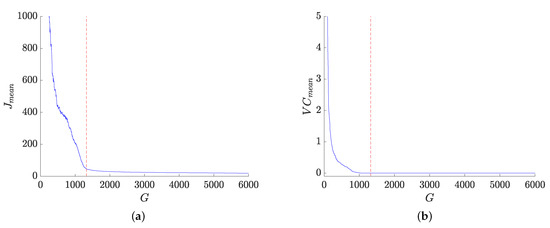 Evolution of the best S-C design execution: (a) Convergence of the mean value of the aggregate function . (b) Convergence of the mean value of the violated constraints .