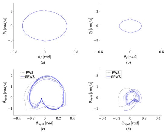 Therefore, the gait characteristics derived from the PWS are used to develop gait cycles in the SPWS with regards to promoting a synergistic relationship between the structural properties and the control design features. Then, the sagittal plane dynamic behavior is associated with the gait cycle periods and , both related to the periodic movements of the system in the PWS and SPWS, respectively.