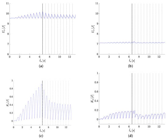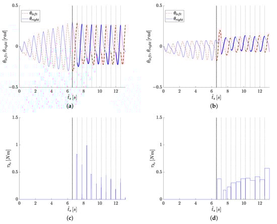 Then, it is assumed that and oscillation periods, which correspond to the PWS and SPWS of the sagittal plane, respectively, must coincide with the frontal plane oscillation period . Therefore, the conditions (28) and (29) are established to achieve a dynamic coupling between the frontal plane motion and the gait period of each walking stage of the sagittal plane. In these expressions, is established as a constant tolerance value.