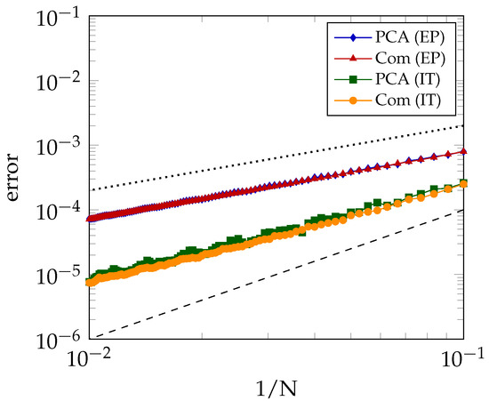 Our first numerical experiment concerns the two adaptations of the temporal discretisation scheme to PDCPs by the EP and IT approaches as described in Section 3.2 for American-style options. Consider Set A and . For a fixed number of spatial grid points, given by , we study the absolute error in the two pertinent discretisations of the PCA-based and comonotonic approximations and in function of the number of time steps . Figure 1 displays the obtained errors with respect to the values computed for a large number of time steps, . Note that these errors do not contain the error due to spatial discretisation, but only due to the temporal discretisation. Figure 1 clearly illustrates that, in the PCA-based as well as the comonotonic case, the IT approach yields a (much) smaller error than the EP approach for any given N. Further, the observed order of convergence for IT is approximately 1.5, whereas for EP it is only approximately 1.0. The better performance of IT compared to EP is well-known in the literature, see, e.g., [14,17,18]. Accordingly, in the following, we shall always apply the IT approach.