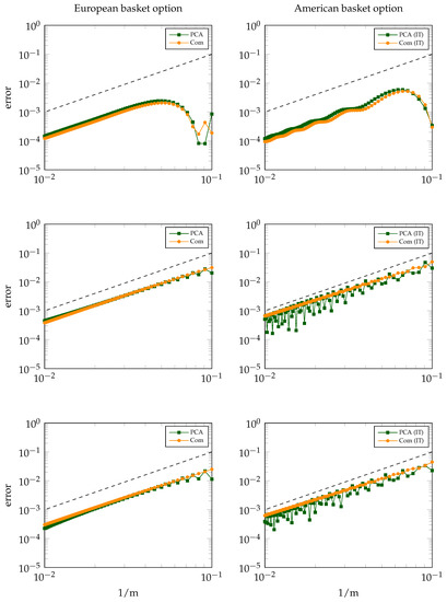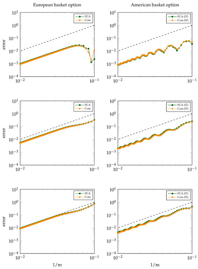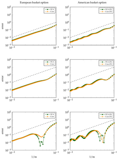 As a main observation, Figure 2 and Figure 3 clearly indicate (near) second-order convergence of the discretisation error in all cases, that is, for all Sets A–F, for both the European and American basket options, and for both the PCA-based and comonotonic approximations. This is a very favourable result. Additional experiments indicate that the error stems essentially from the spatial discretisation (and not the temporal discretisation).