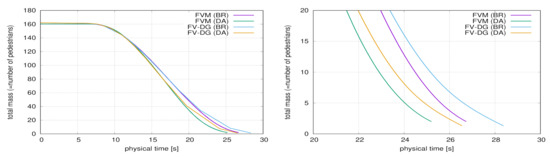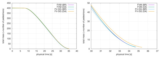 T-shape domain, the time evolution of the total number of pedestrians for the finest grid = 10,310 (FVM) and = 10,848 (FV-DG), total view (left) and the detailed view close to the end of the evacuation (right).