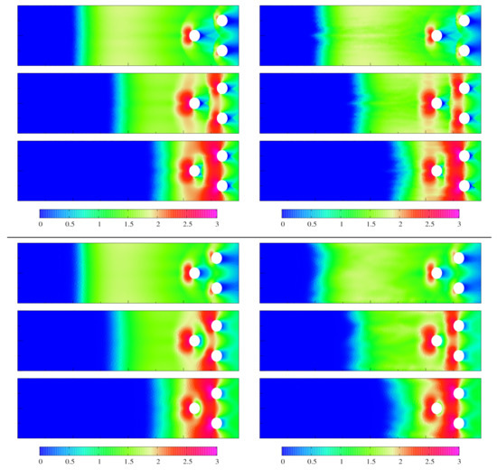 Here we present results for the simulation of the evacuation of the rectangular domain 40 × 10 m with three circular obstacles, see Figure 1 (bottom). We suppose boundary and initial conditions and also parameters of the model to be the same as for one circular obstacle above.