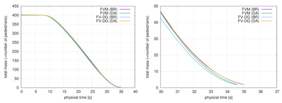In Figure 2, the evolution in time s of the pedestrian density is drawn. The intuitive movement of pedestrians towards the right hand side can be observed. In each row of figures, the FV and the FV-DG methods are compared. We see all methods are in a good agreement. In Figure 3 the time evolution of the total number of pedestrians is shown.