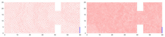 H-shape domain, examples of the computational grids (FV-DG) with (left) and = 12,742 (right) elements, the exits at the right-hand side bottom corner are marked by the blue color.