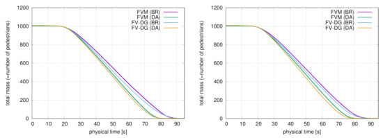 Table 3 shows the computational results obtained by the FV and by the FV-DG methods. See the description of table, the use of the DA or BR algorithm in the pedestrian flow model (both FV and FV-DG) causes more significant differences in the evacuation time . On the other hand the FV and FV-DG model with the same type of the computation of the desired direction of motion (i.e., DA or BR) produce the and being in a good agreement. The dependence of the pedestrian evacuation model on the use of the DA or BR algorithms has to be further studied.