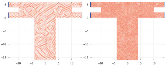 T-shape domain, computational grids (FV-DG) with (left) and = 10,848 (right) elements, the exits are marked by the blue color.